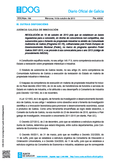 La Axencia Galega de Innovación (GAIN) publica hoy en el Diario Oficial de Galicia la Resolución, de 10 de octubre, de por la que se establecen las bases reguladoras para la concesión, en régimen de concurrencia no competitiva, de subvenciones para el fomento de la protección de la propiedad industrial en Galicia, cofinanciadas por el Fondo Europeo de Desarrollo Regional (Feder), en el marco del Programa operativo Feder Galicia 2007-2013, y se convocan para este año 2013.